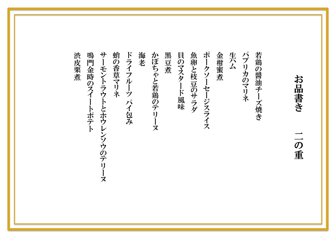 京の感性を映した彩り豊かな洋の美味を盛り込み、華やぎあるひとときを演出する新しい二段重。